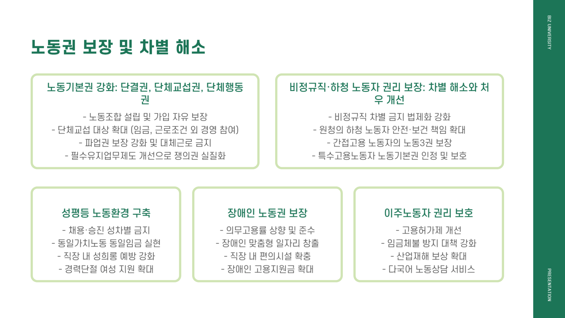 - 청년 정규직 채용 위축 가능성 → 채용 쿼터제·인턴 고용 인센티브