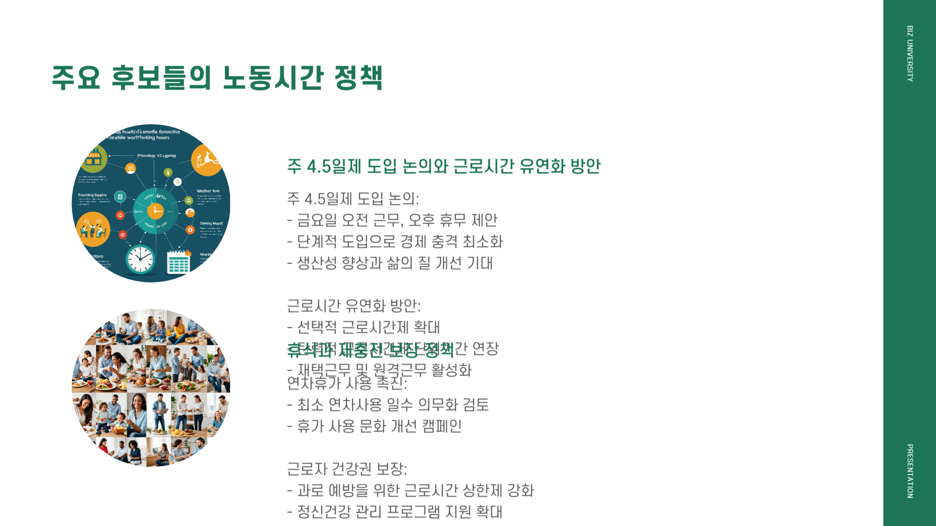 | 이재명 (더불어민주당) | 주 4.5일제 로드맵 | ▸ 법정근로시간 37.5 h(주 4일 8h + 금요일 4h) ▸ 연장근로 12h 유지 → 최대 주 49.5 h |