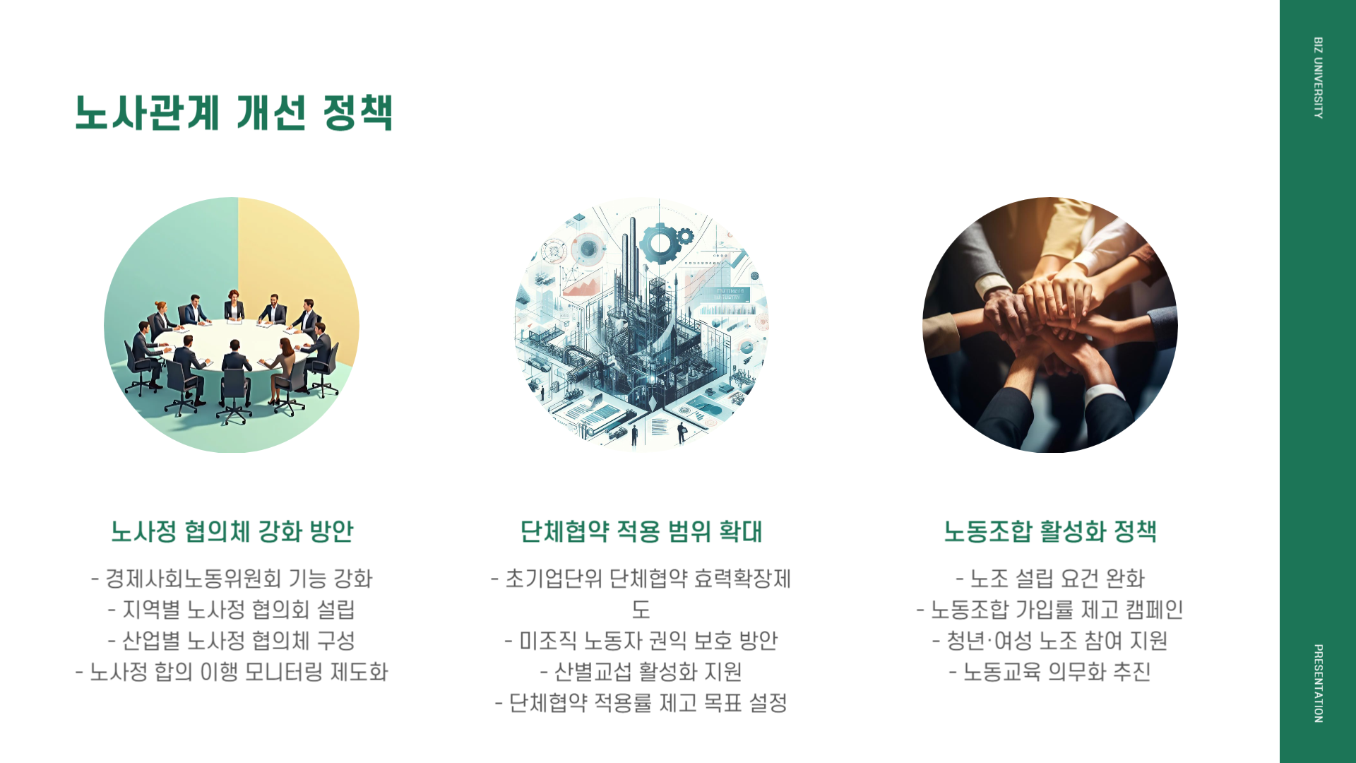 - 노사 사회적 대타협 : ‘근로시간 단축 ↔ 생산성 혁신 ↔ 청년고용 확대’ 패키지