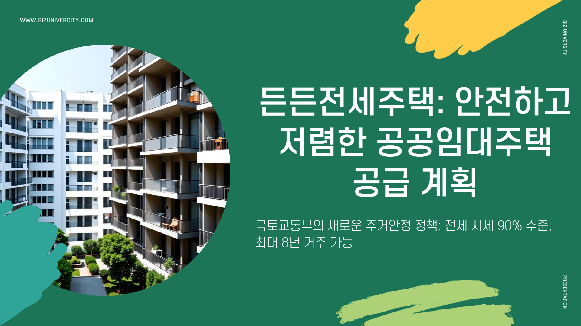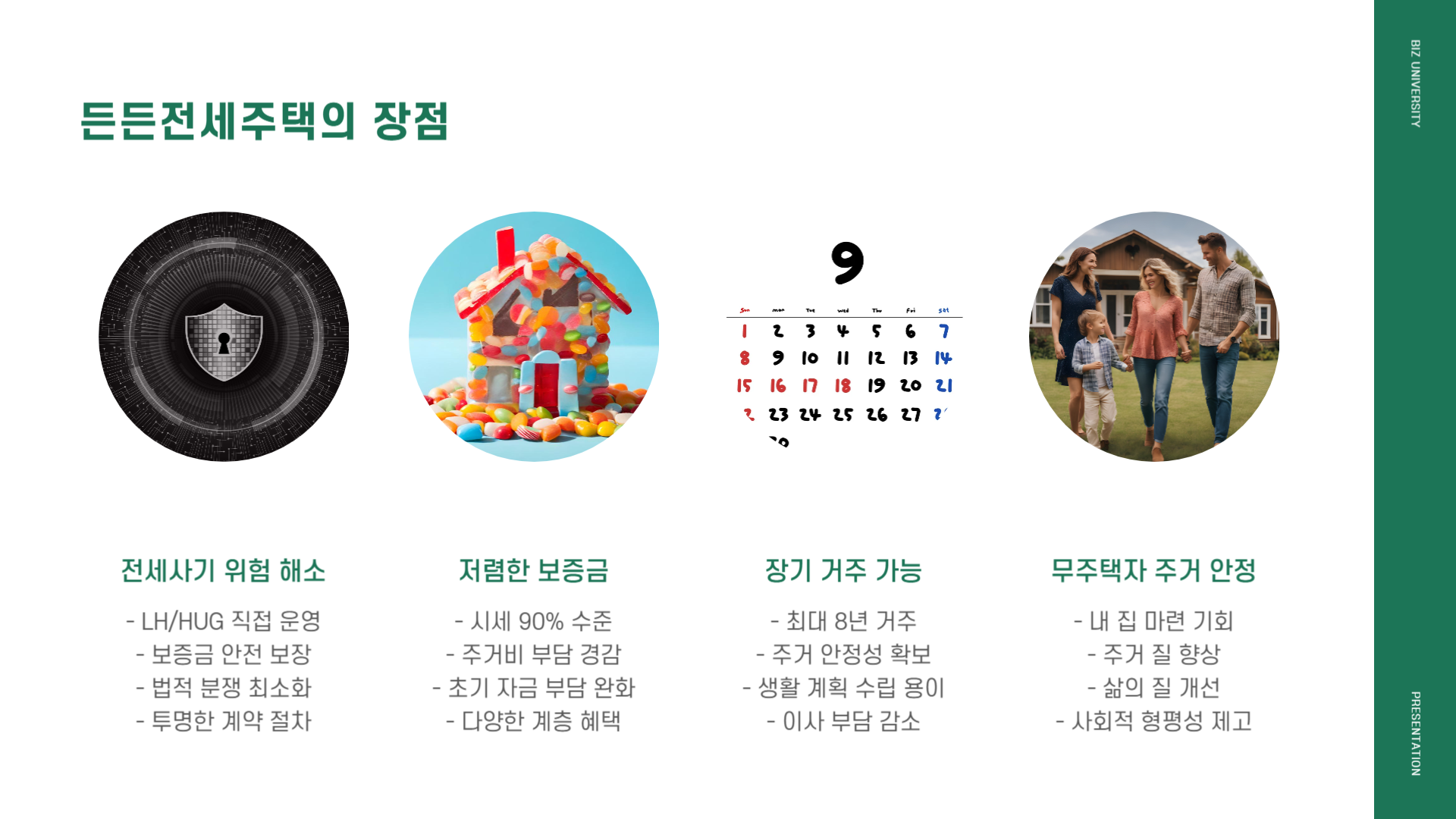 - 입주자 권리 : ‣ 2년 단위 전세금 인상률 5 % 상한 ‣ 최초 임대보증금·관리비 HUG 보증 가입