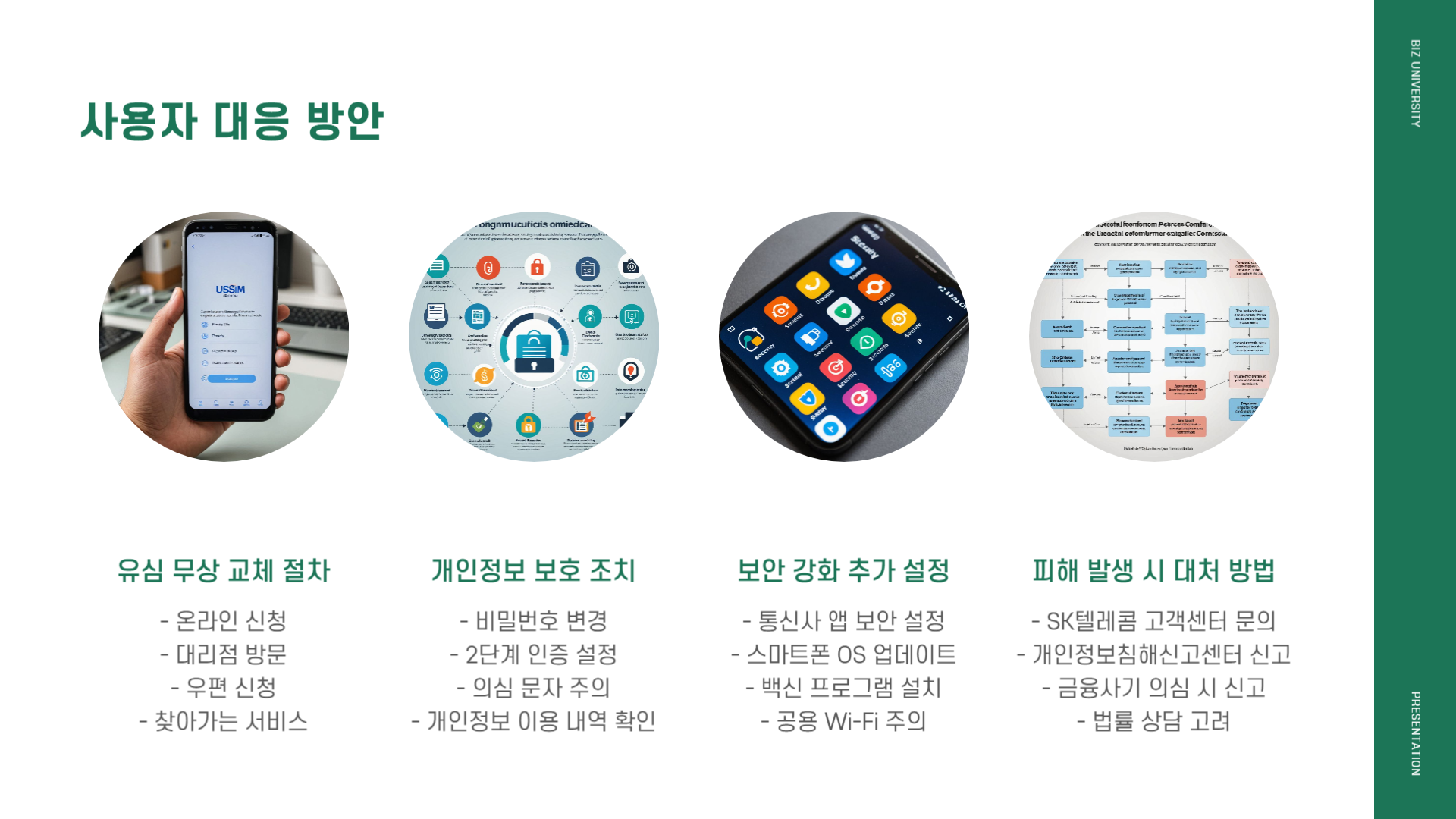- 의심 문자·통화 기록 발견 시 즉시 통신사 고객센터로 유심교체 가능 여부 재확인