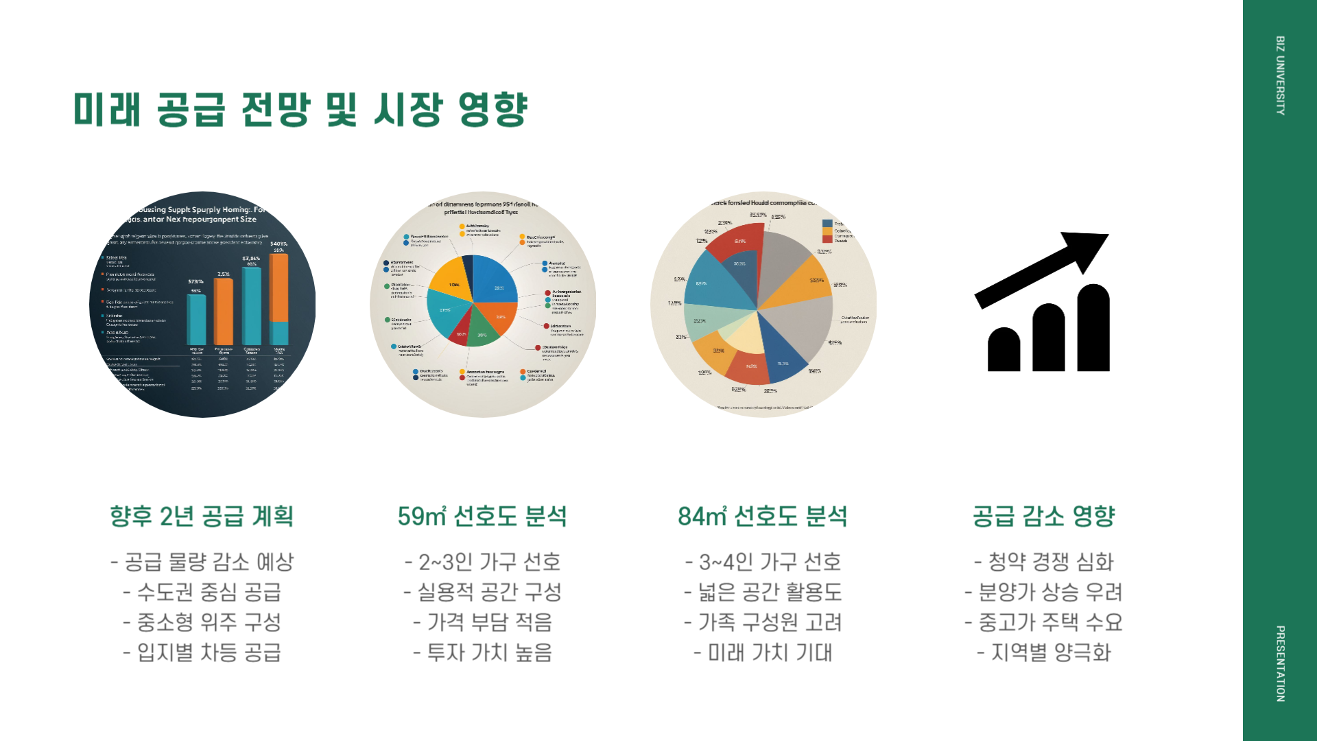 - 향후 2년 공급 감소 시 세대별 59 ㎡(2~3인 가구)·84 ㎡(국평) 주력 평면에 청약 열기가 계속될 가능성이 높다.