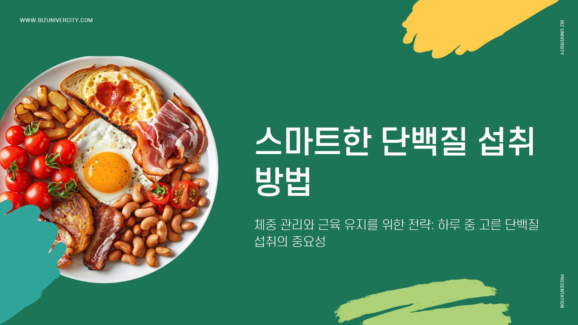 단백질 섭취는 하루 중 특정 끼니에 몰아먹기보다 아침·점심·저녁·스낵에 고르게 배분하는 것이 체중 관리·근육 유지·에너지 대사에 모두 유리하다. 위 메뉴를 로테이션하면 하루 단백질 목표량을 무리 없이 달성하면서 맛과 환경까지 고려한 지속 가능한 식단을 완성할 수 있다.