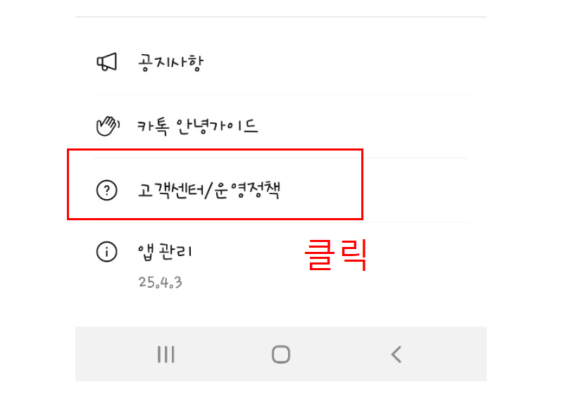스크롤을 내려서 "고객센터 / 운영정책" 을 클릭합니다.