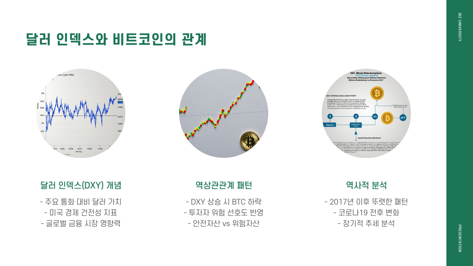 - 2020~21년 코로나 양적완화기: DXY 102 → 89(-13 %) 하락, 같은 기간 BTC 4 K$ → 64 K$(+1,500 %)로 급등 → 상관계수 -0.57