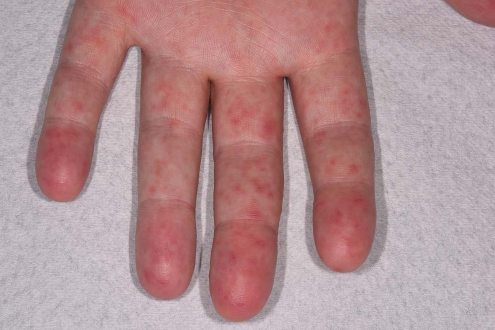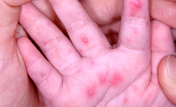 - 손바닥·발바닥·입 안 점막에 물집·수포
