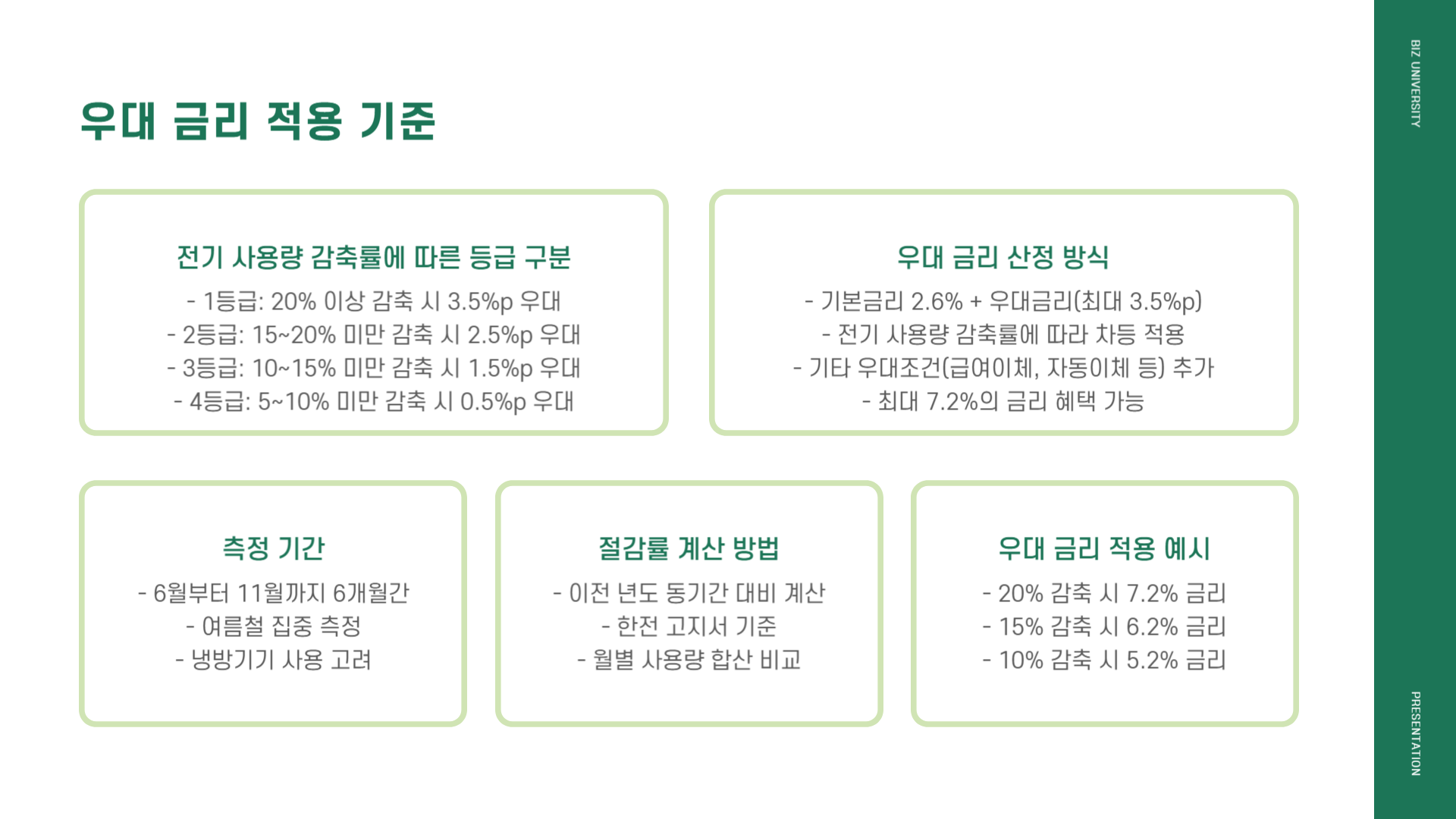 | 에너지절감 우대 | 전년 동기간 대비 전기사용량 ↓ · 0 % 초과~5 % 이하면 +1.5 %p · 5 % 초과면 +3.5 %p |