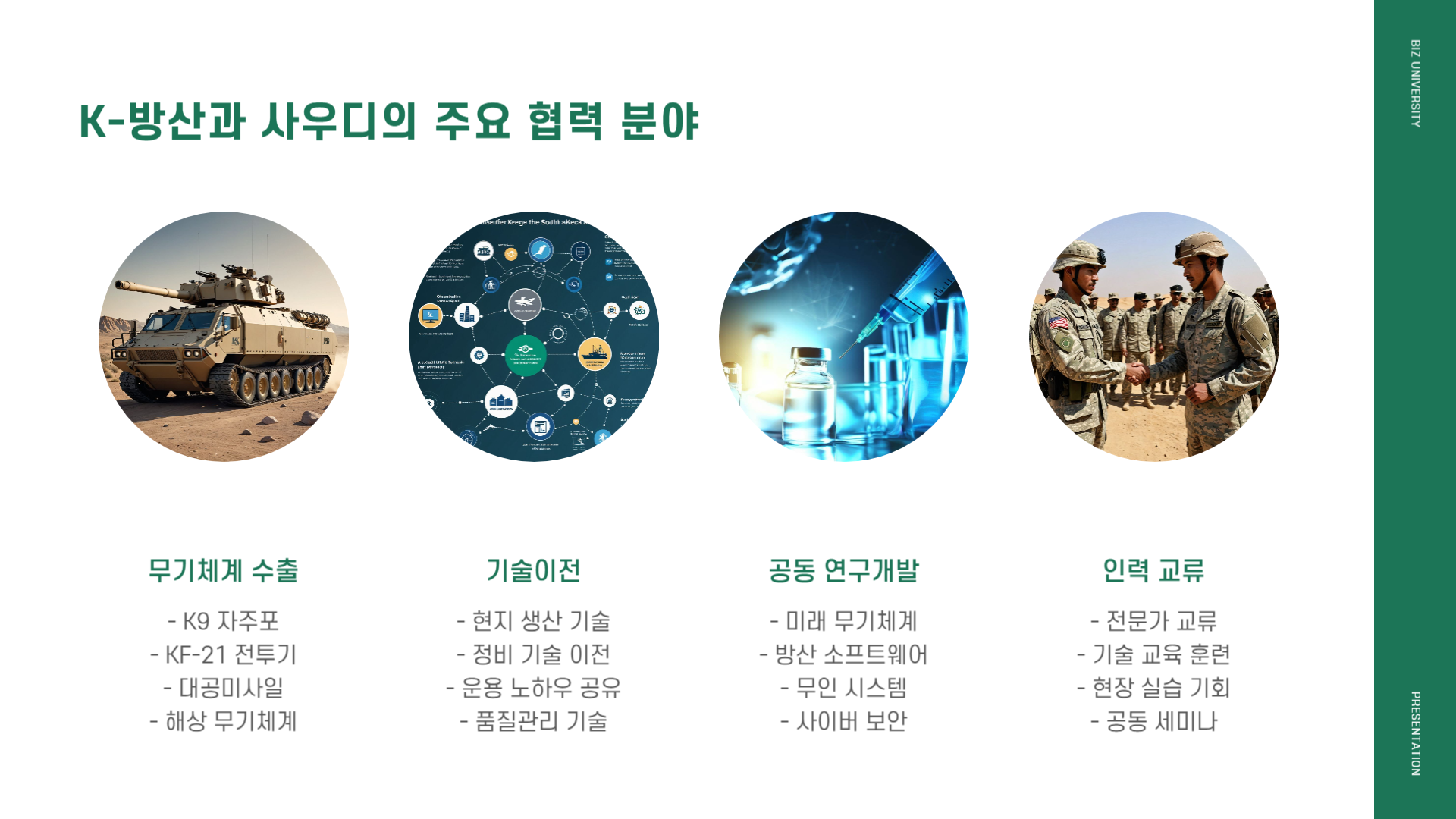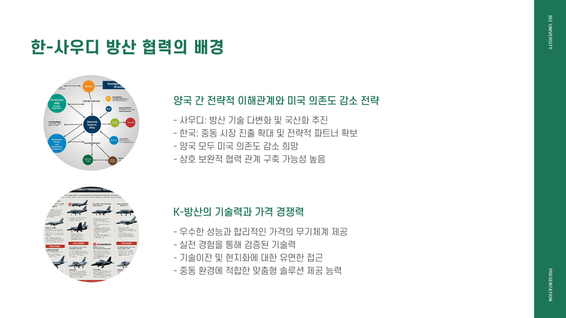 | 사우디 Vision 2030 | ‘탈(脫)석유’와 국방 자주화가 핵심. 2030년까지 국방 예산의 50 % 이상을 자국 내에서 소화한다는 목표. |