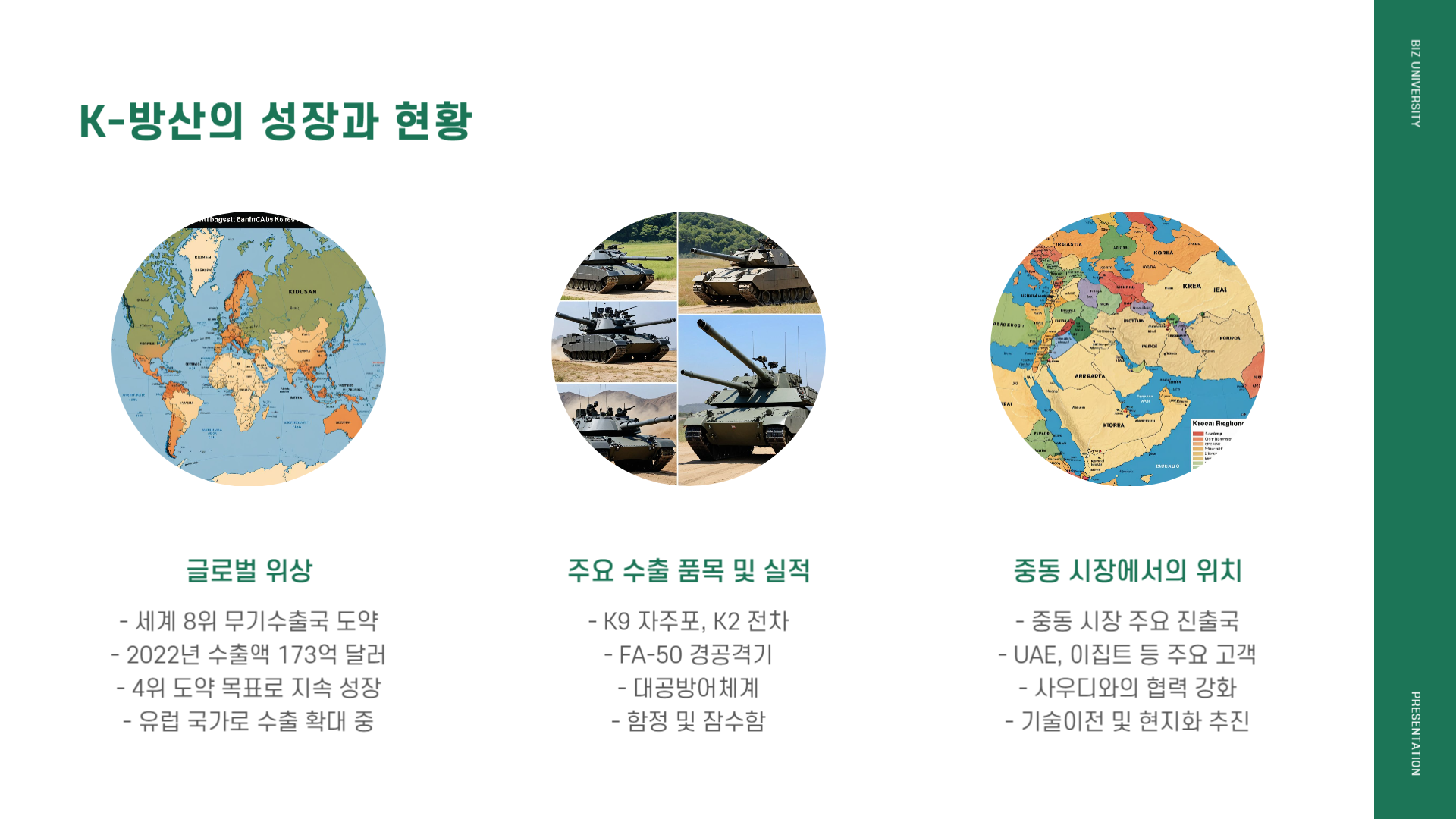 | 글로벌 경쟁 격화 | 美·佛·中·터키 기업이 적극 구애 → 한국 방산이 가격 경쟁력·납기·기술 이전을 강점으로 내세움. |